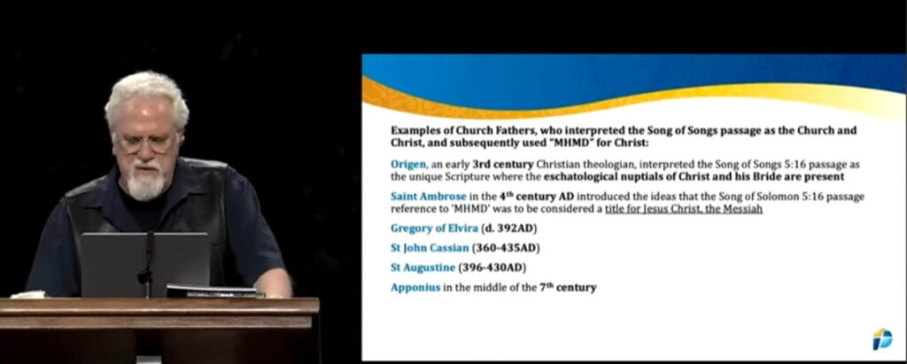 This is what Mel says: “I’m sure I could have picked any number of Christian writers down through the centuries, but St. Ambrose writing in 387 AD interprets Song of Songs as being about Jesus and his church. …. Now when we go to verse 16, it’s now referring back to Jesus. So it’s like the Church is responding to Jesus and saying, ‘His mouth is sweetness itself. He’s altogether lovely. This is my beloved. This is my friend, Daughters of Jerusalem.’ So that’s how the Church interpreted that. So makmedeem/MHMD, for Christians, right up to the seventh century, when they saw it in the Bible, they would have interpreted it as referring to Jesus. They would have been scratching their heads if someone said, ‘Oh it’s to do with an Arabian Prophet. They would have said, ‘Don’t be ridiculous. This is actually to do with Jesus.’ That’s how they would have interpreted it, and they would have interpreted it that way for literally 700 years okay now. … So what is makmedeem/MHMD then? It’s um it’s a reference to Jesus. It’s Jesus being referred to as the Messiah.”
