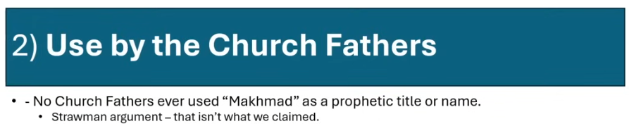 Let us begin with Jay Smith’s slide from his Chino Hills Calvary Church presentation, where the pastor unwisely invited him to teach falsehood to the church. Introducing this slide, Jay Smith says, “This Makmed/MHMD was employed by many of the Church Fathers.” This is a falsehood. It was employed by none. Jay Smith is telling falsehoods about the Church to a Christian audience, and this is being not only tolerated by supported by the leadership at Chino Hills.