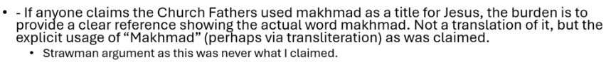 In fact, in his speeches, Jay Smith is now so confused that he claims that Ambrose (d. 397), a Latin Father, wrote in Syriac and introduced the use of “makmed/MHMD” to Christian circles and then the 3rd century Origen picks it up from him: “From that time on, from the 4th century AD, this Makmed/MHMD was employed by many of the Church Fathers.” Jay Smith makes this mistake because he heard the claim about Ambrose first, on November 4, 2023, and at that time, Jay came away with the impression that Ambrose was the first to introduce “Makmed/MHMD” as a title of Jesus to Christians. Later on, Mel brought him the additional AI hallucinated list that included multiple Fathers who were earlier than Ambrose. But having already made up a story in his mind, Jay Smith was not able to change his understanding to accommodate these additions in a coherent way. So his narrative is now not only riddled with errors but requires time travel. This demonstrates a severe cognitive deficit.